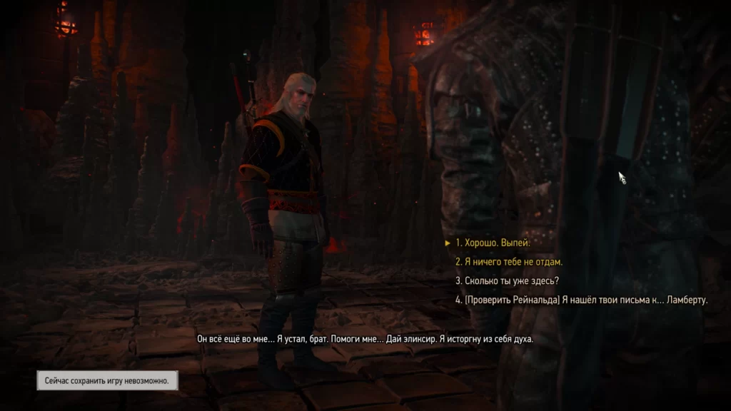 Освобожденный ведьмак просит отдать ему сваренное зелье, чтобы избавиться от проклятья Мора. Личность стоящего перед нами можно проверить – Геральт намеренно меняет имя Осмунда, друга Рейнальда, называя его Ламбертом. “Рейнальд” уловки не замечает, и так мы понимаем, что перед нами не брат по профессии, а захвативший его тело призрак. Отказываемся отдавать зелье, выпиваем его сами и приступаем к битве.