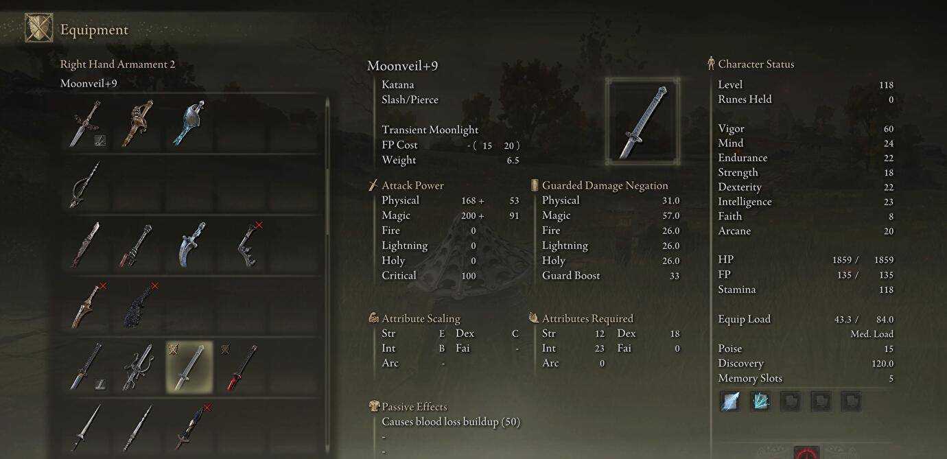 Moonveil требует стат интеллекта 23, но обладает искусством оружия Transient Moonlight.