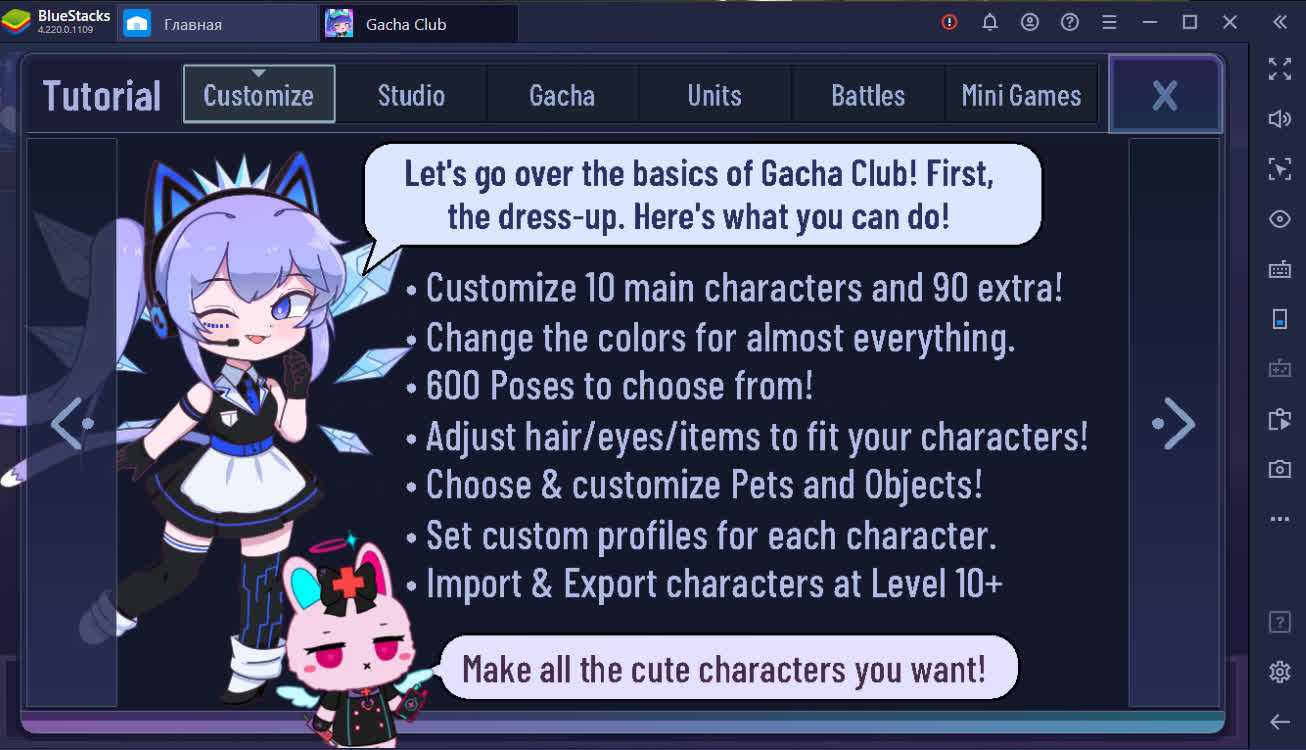 Фея Bella и маскот Usalina — ваши инструкторы и главные проводники на протяжении всего сюжета. В обучении освещаются такие аспекты Gacha Club, как подбор одежды и аксессуаров персонажам, режим студии, битвы, юниты, мини-игры и, конечно же, механика гача. Все вкладки туториала отображаются вверху экрана. Вы можете переходить между ними в свободном порядке или закрыть туториал, нажав на крестик в правом верхнем углу окна. Инструкции можно прочесть еще раз в любое время, найдя опцию Tutorial в игровых настройках.