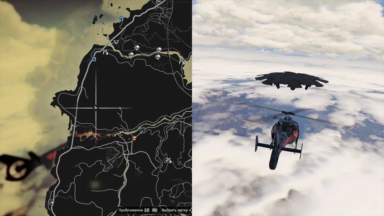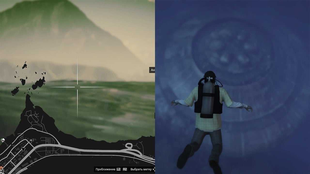 С помощью дырки в текстурах, которая находится на заднем дворе полицейского участка в восточном Лос-Сантосе, можно попасть под карту. Запаситесь парашютом, подгоните внедорожник, как показано на скриншоте ниже, и прыжками найдите проход за текстуры.