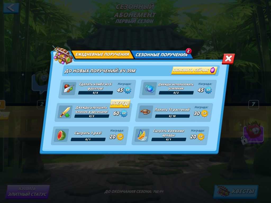 Второй способ заставить игроков почаще заходить в Fruit Ninja 2 — квесты. За выполнения которых начисляются очки, при достаточном количестве разблокируется награда. Кристаллы, скины, бонусы, семена, клинки, золото и билеты. Чтобы получить максимальное количество наград, создатели предлагают купить элитный статус за $9,99. Система очень напоминает Brawl Pass в Brawl Stars.