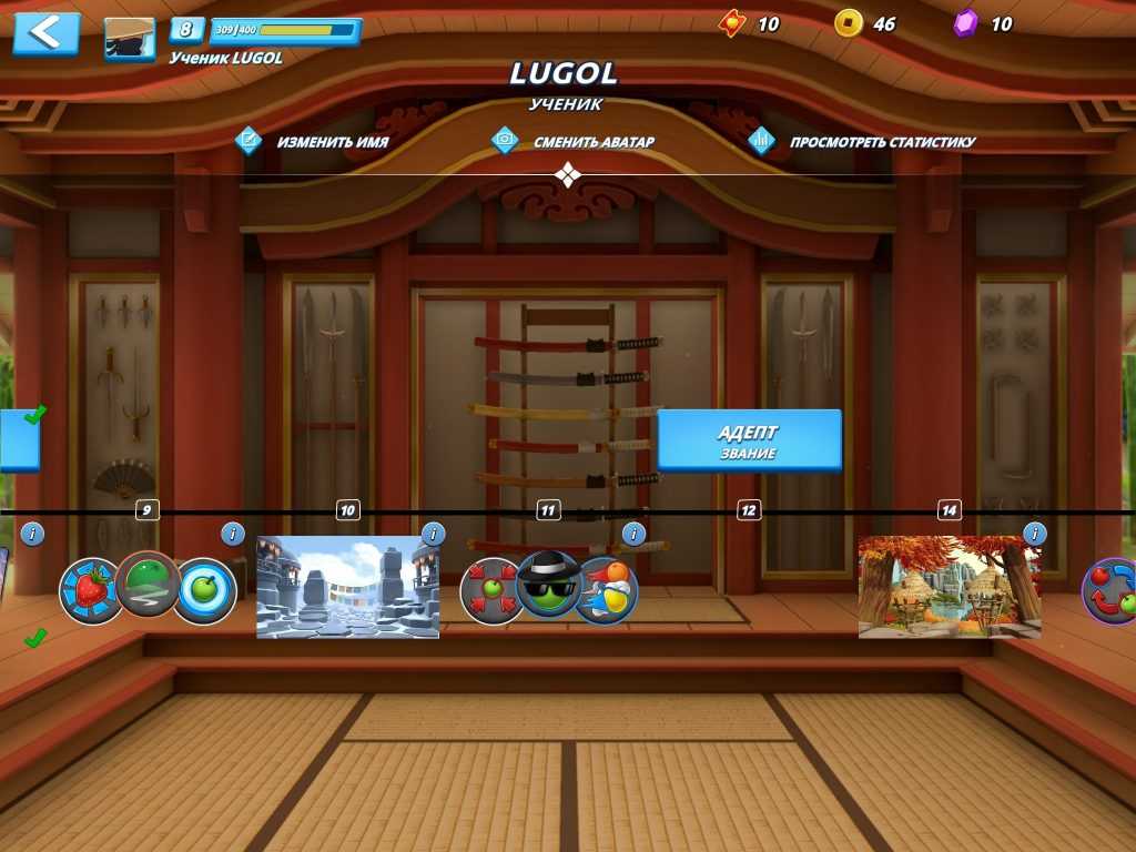 - Zen : В режиме Zen продолжительность игры составляет 1:30 минуты, бомб и жизней не будет, поэтому вам нужно будет только попытаться нарезать как можно больше фруктов. Как и в предыдущем режиме, перед началом игры можно будет выбрать клинок, фон и улучшения.