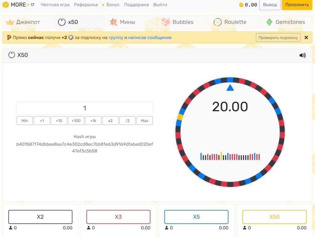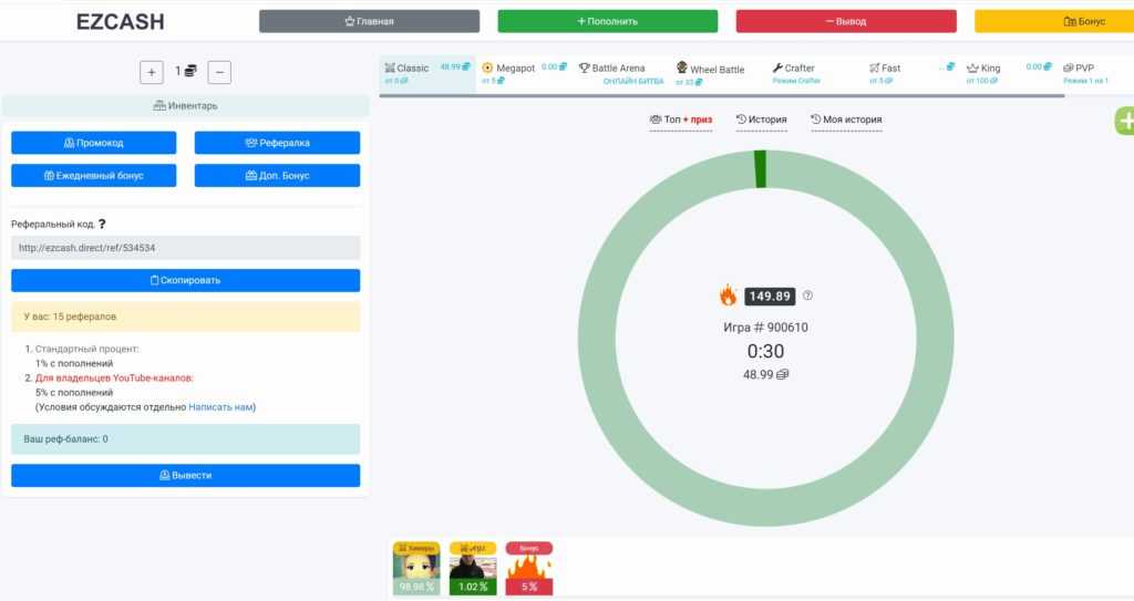 Игрокам доступно 6 режимов, ежедневный бонус (до 99 рублей), а также подарок за регистрацию 2 рубля (только нужно вступить в группу ВК). Активировать выплаты не придется, деньги выплачивают на карты, ЮMoney, Payeer и QIWI. Минимальный порог 100 рублей. Приглашайте рефералов, за ввод вашего кода они получат по 1 монете, а вам будет приходить 10% от комиссии системы по каждой ставке (для видеоблогеров 15%).