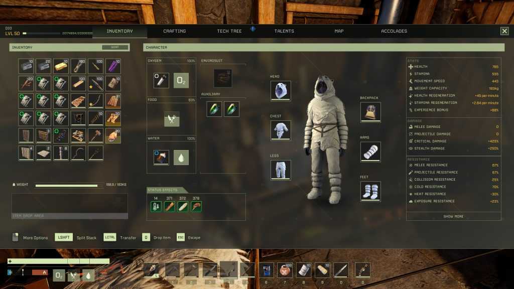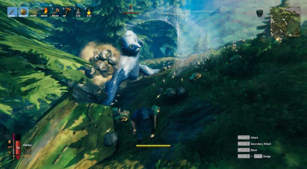 Valheim re-imagines staple survival features, with the intent of alleviating frustration by making interacting with them rewarding rather than punishing. There’s a hunger meter, but going hungry won’t kill you — instead, you gain extra health and health regen by having a high hunger bar, with specific food giving specific extremely useful buffs. There are weather conditions, but most won’t kill you if you don’t have appropriate clothing, just apply temporary debuffs that hinder you. Shelter however is pretty traditional, in that it protects you from roaming enemies while you rest, and occasionally there are events which cause hordes of enemies to rush you, where having a well-developed shelter can greatly improve your chances of survival.