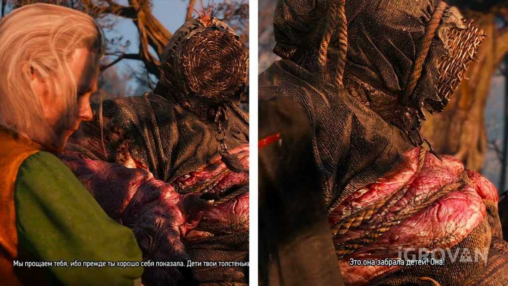 5. После освобождения духа, в разговоре с ведьмами как раз и возникнет баг — сначала они скажут, что прощают Анну, ибо она хорошо откормила детей. После слов ведьмака об освобождении духа с холма, ведьмы ответят, что это измена и вот оказывается, кто забрал детей. Т.е. в одном диалоге с ведьмами всплывут реплики из обеих концовок квеста — как будто бы сначала Анна детей сберегла, а потом — нет.