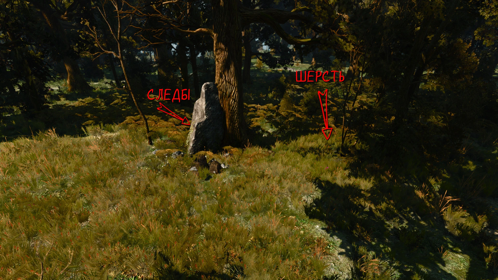 Идите туда, где были волки (левее от белого камня у дерева, если потерялись) и осмотрите сначала труп собаки, а после следы рядом. Геральт скажет, что это волколак. Подойдите к белому камню и осмотрите следы на нем. Затем пройдите за камень и на земле, в траве, вы найдете клок шерсти. Идите по запаху.