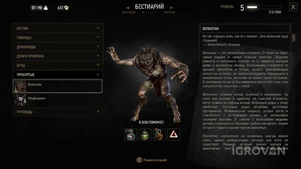 Прежде чем начать бой с волколаком, вы должны изучить информацию о его поведении и слабостях. Ведьмаковская бестиария содержит много полезной информации о волколаках, включая их атаки, уязвимости и прочее.