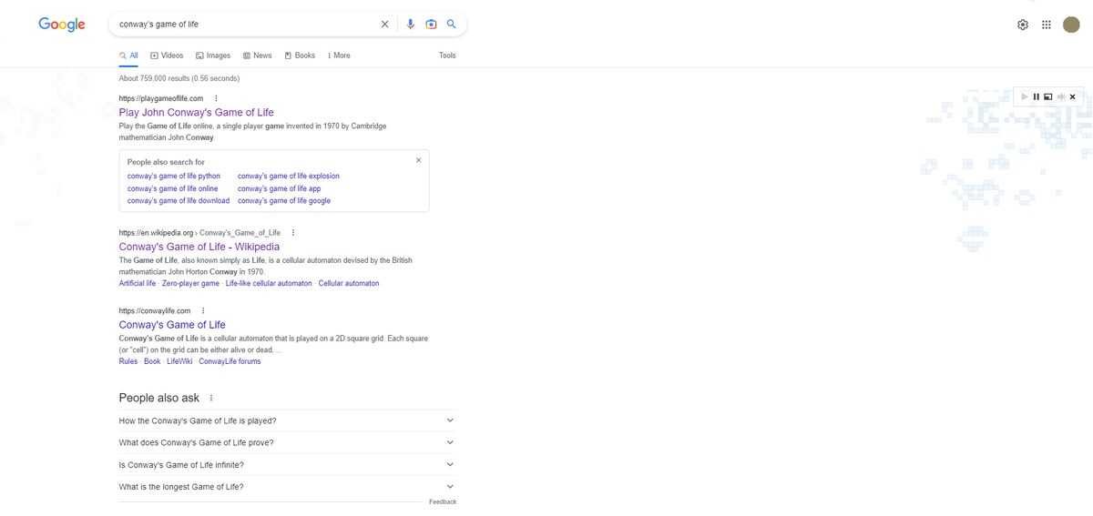 В модели «Жизни» клетки рождаются, существуют и умирают по определенным принципам. Подразумевается, что игрок предлагает исходную комбинацию клеток, а потом колония живет своей жизнью и размножаются по логике Конвея — иногда может и вовсе погибнуть. В пасхалке исходную комбинацию клеток задает не пользователь, а сам Google, но все равно забавно.
