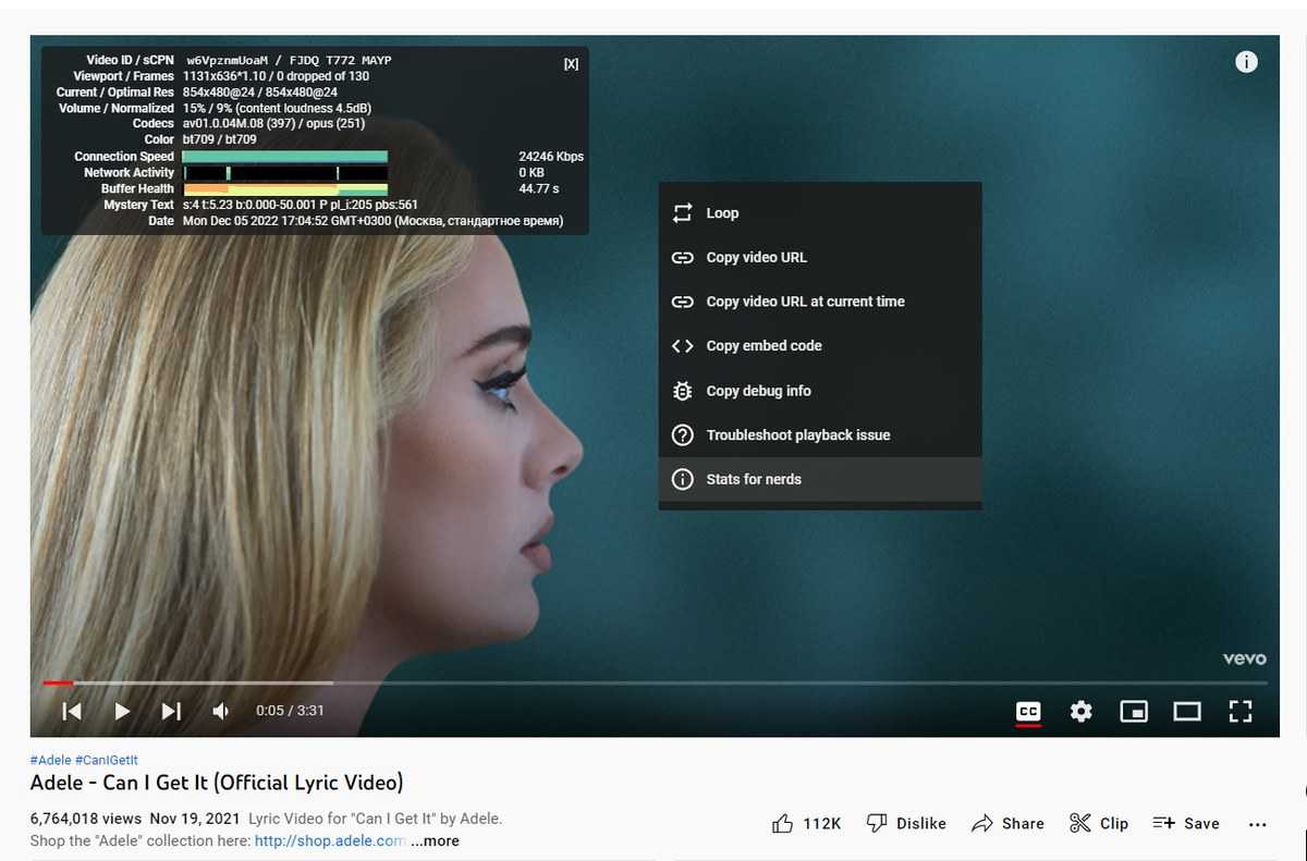 Кликните на любое видео правой кнопкой мыши — в самом низу найдете секретную опцию «Stats for nerds» — в русском переводе Google «Статистика для сисадминов». Открывайте ее, и там увидите подробную информацию о размере видео, разрешении, задействованных цветах и даже скорости своего интернет-соединения. Действительно занудно, но вдруг когда-нибудь пригодится?