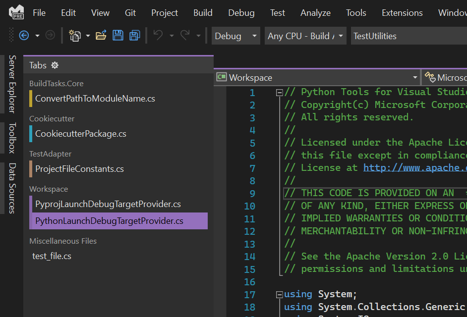 Новые возможности Visual Studio 2019 версии 16.4 и более поздних : мы добавили одну из наиболее часто запрашиваемых функций — вертикальные вкладки документов. Теперь вы можете управлять вкладками документов в вертикальном списке в левой или правой части редактора.