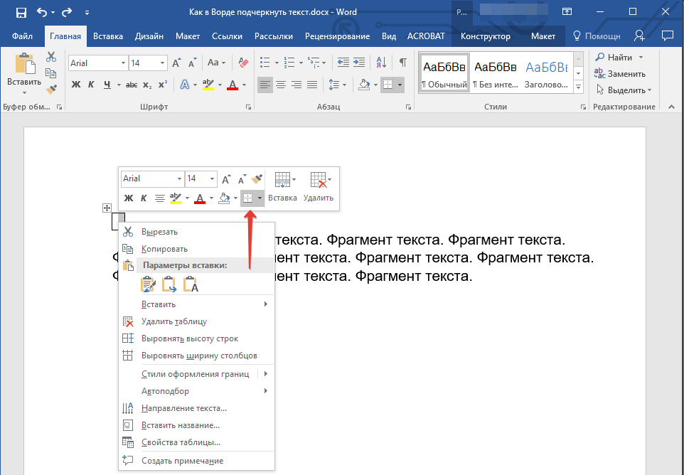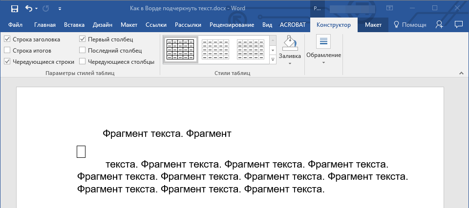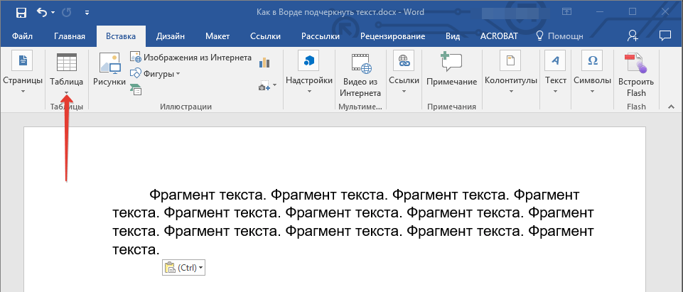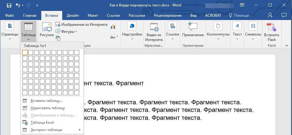 Щелкните место, куда требуется вставить подчеркнутый пробел. На вкладке Вставка в группе Таблицы нажмите кнопку Таблица. Вставьте таблицу размерностью 1×1, щелкнув левое верхнее поле. , а затем перемещайте указатель влево или вправо, чтобы удлинить или укоротить линию подчеркивания.