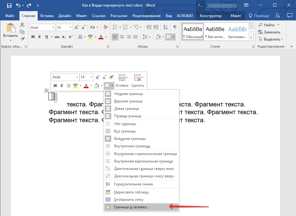 5. Кликните в этом месте правой кнопкой мышки и нажмите на кнопку “Границы”, где выберите в списке “Границы и заливка”.