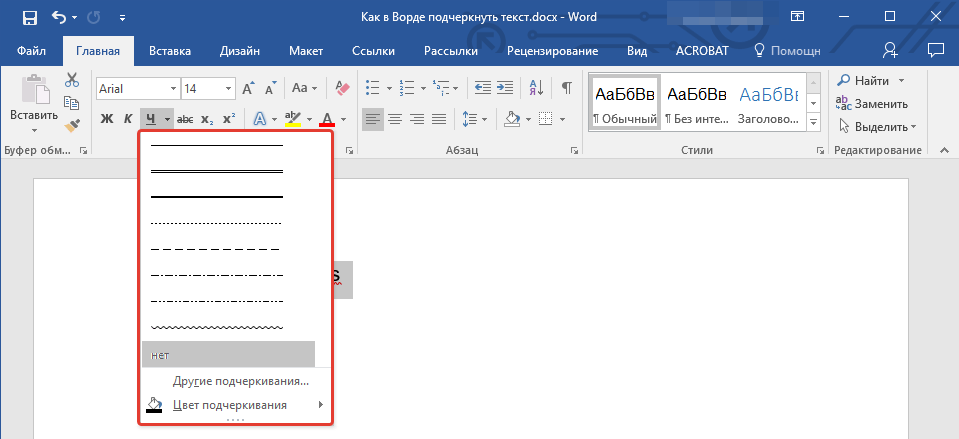 2. Разверните меню кнопки “Подчеркивание” (группа “Шрифт”), нажав на треугольник возле нее.