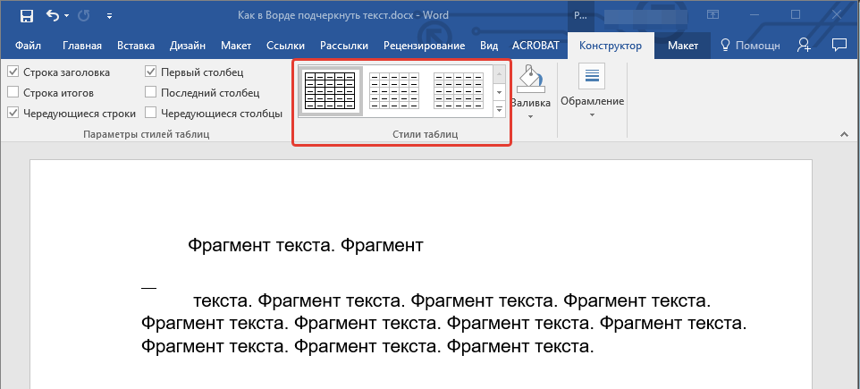 7. В разделе “Стиль” (вкладка “Конструктор”) выберите желаемый тип, цвет и толщину линии, которая будет добавлена в качестве подчеркивания.