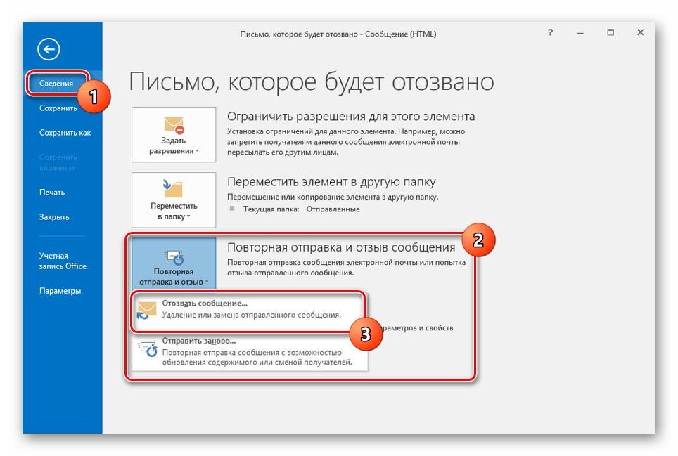 Нажмите «Файл» на верхней панели, перейдите к разделу «Сведения» и кликните по блоку «Повторная отправка и отзыв». Из выпадающего списка выберите «Отозвать сообщение…».