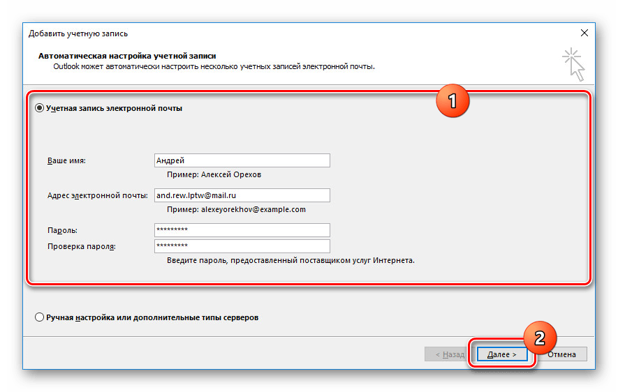 Заполните поля, указав свое имя, адрес и пароль от ящика Mail.Ru. После этого воспользуйтесь кнопкой «Далее» в правом нижнем углу.