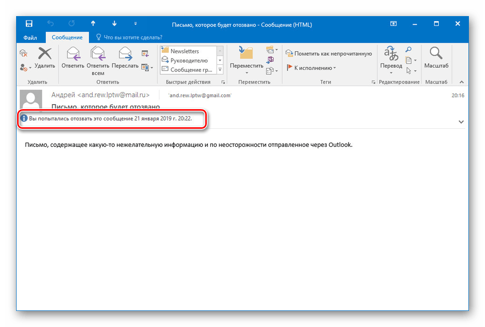 Отозвать можно любое письмо, отправленное и полученное в рамках Outlook, лишь в том случае, если адресат: