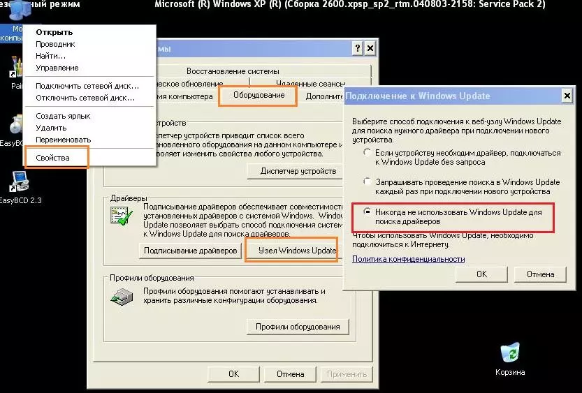 не забудьте заставить Windows не лазать за обновлениями (хотя какие там обновления — это же старушка XP…) и установим запретить установку устройства через узел обновлений: