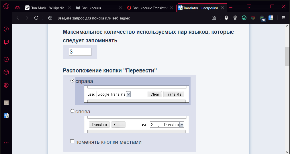 Здесь же есть окно для вставки фрагмента текста и ссылка «Настройки», которая ведёт к списку расширенных параметров. Мы можем изменить местоположение кнопки «Перевести» и указать максимальное количество языковых пар, которое расширению нужно помнить.