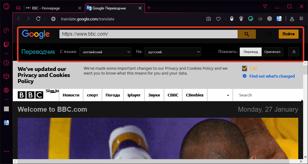 Откройте любую иноязычную веб-страницу в браузере Opera GX.
