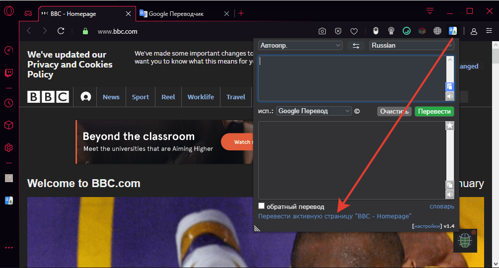 - Если этого не случилось, нажать на кнопку «Перевести». Она находится в верхней панели браузера. К сожалению, плагины не всегда работают в Опере, как нужно. Если и нажатие на кнопку не дало результатов, рекомендуется обновить страницу и немного подождать. Затем стоит перезапустить браузер и попробовать опять.