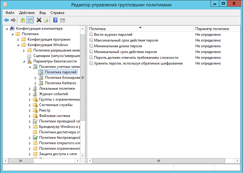 Ограничение на параметры парольной системы защиты задаются в контексте «Конфигурация компьютера». Выберите Конфигурация Windows –> Параметры безопасности –> Политики учетных записей –> Политика паролей.