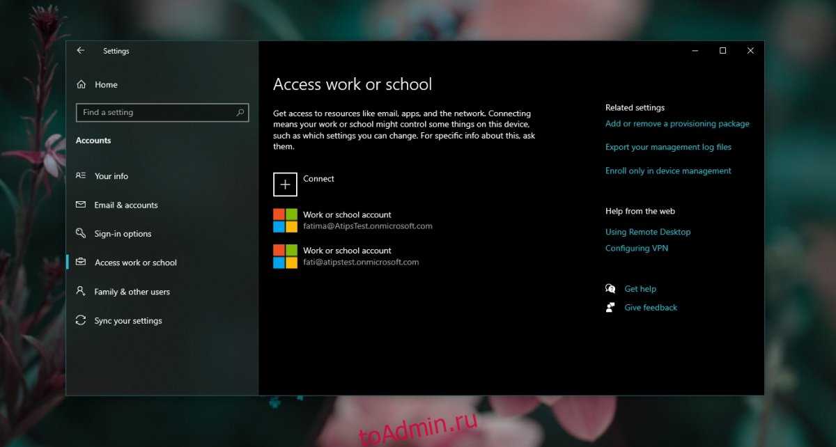 Откройте приложение «Настройки» с помощью сочетания клавиш Win + I.Зайдите в Аккаунты.Перейдите на вкладку Работа и учеба Access.Щелкните кнопку Подключить.Войдите в свой аккаунт.