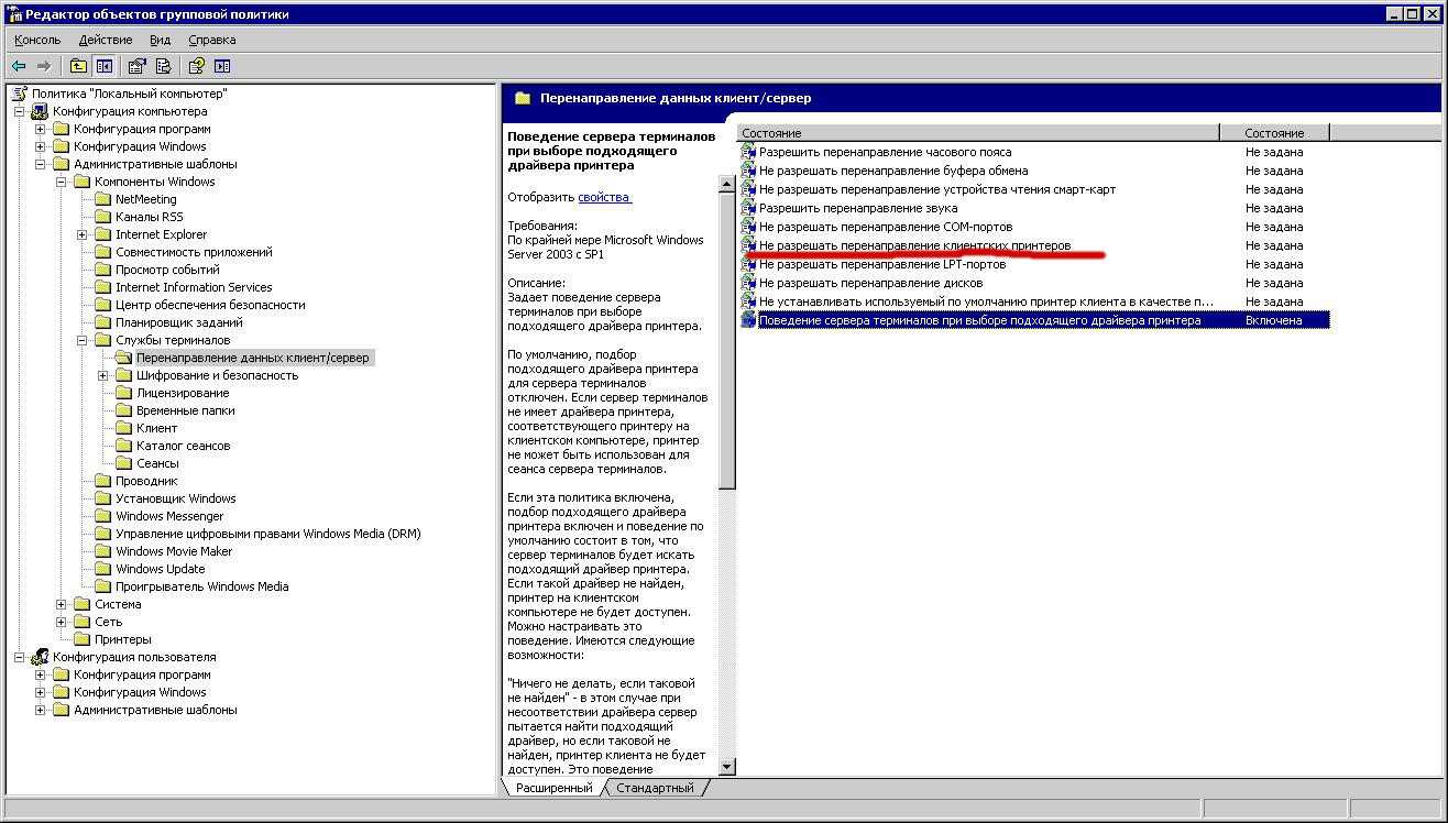 Если настройки по перенаправлению принтеров выполнены как указано выше, то принтер будет перенаправляться ТОЛЬКО в том случае, если на терминальном сервере ТАКЖЕ установлены драйверы на принтер того производителя и той модели, который стоит у юзера локально. В противном случае перенаправляемый принтер на сервере терминалов скорее всего создан не будет, а в журнале событий «Система» появится сообщение от провайдера TermServDevices с кодом 1501 и содержанием, указывающим на то, что на терминальном сервере не установлен соответствующий драйвер.