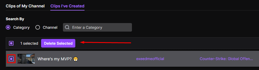 - Здесь вы можете сортировать клипы по просмотрам, дате создания, категории и многому другому. Вы также можете выбрать, хотите ли вы просматривать клипы, созданные вами, или клипы, которые другие люди сделали из вас во время одной из ваших трансляций.