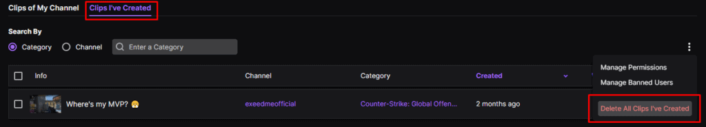 Если вы хотите удалить каждый созданный вами клип или все клипы, созданные на вашем канале, вы можете сделать это, выбрав «Клипы, которые я создал» или «Клипы моего канала». Затем нажмите на три вертикальные точки, как показано на изображении ниже.