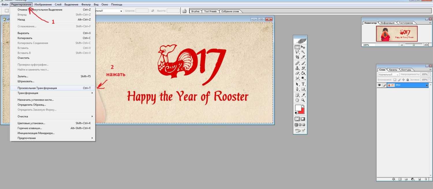 Заходим вверху в меню «Редактирование» => Произвольная трансформация.