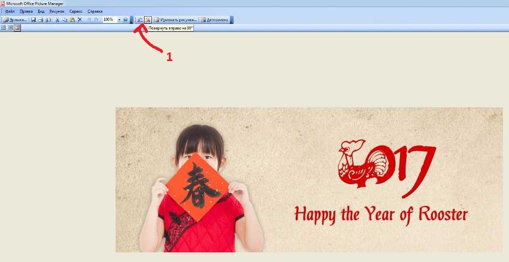 Если у вас установлена программа и Микрософт Офис, а именно Microsoft office picture manager, то это уже полноценный вариант для поворота картинок на несколько градусов. Сделать это можно так. Открываем картинку в этой программе и нажимаем иконку показанную на картинке 1. С помощью этой опции можно повернуть на 90 градусов и соответственно кратно этой величине.