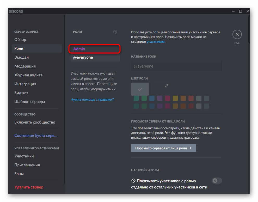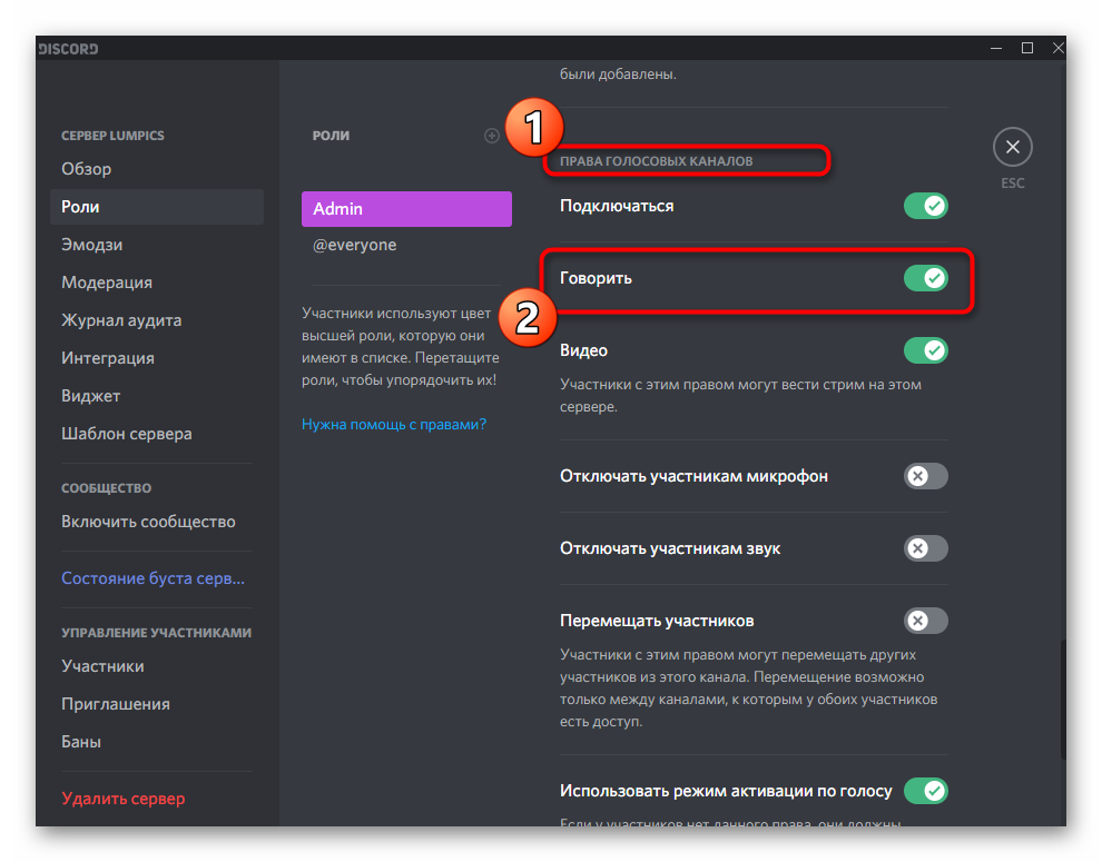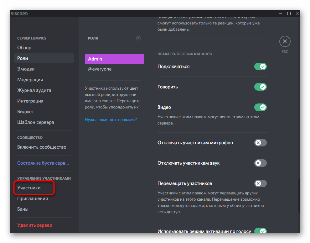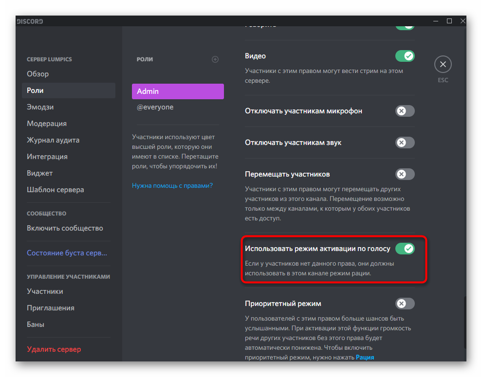 Этот блок с информацией по настройке микрофона будет полезен только создателям и админам серверов в Discord, так как мы будем обсуждать разрешения для участников. Переключение ролей позволяет ограничить использование устройства, установить приоритеты или отключить голосовую активацию. Это доступно как для полной роли, так и для любого голосового канала на сервере. Рассмотрим весь процесс на примере настройки роли: