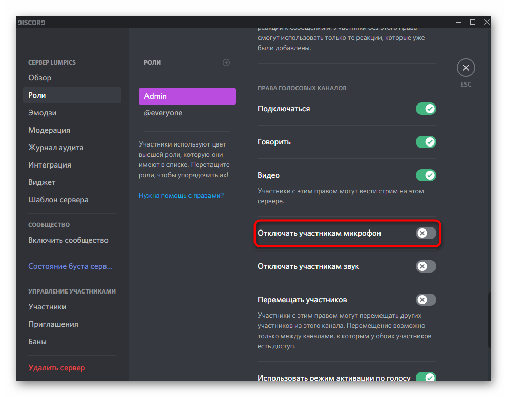 Вы можете назначить право отключения звука членам роли администратора, что полезно для быстрой модерации, когда это необходимо.