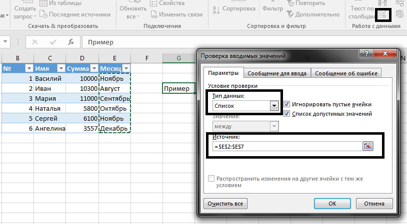 Пример проверки данных: создание раскрывающегося списка в Excel