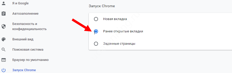 2. В разделе опций «При запуске открывать» установите «Ранее открытые вкладки».