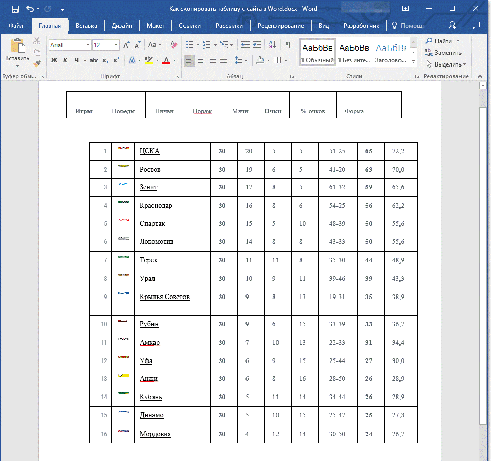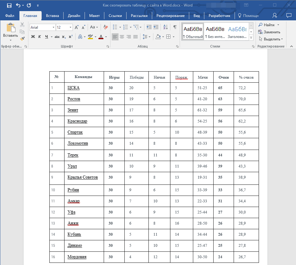 - Откройте скопированный документ в Word и просмотрите таблицу.