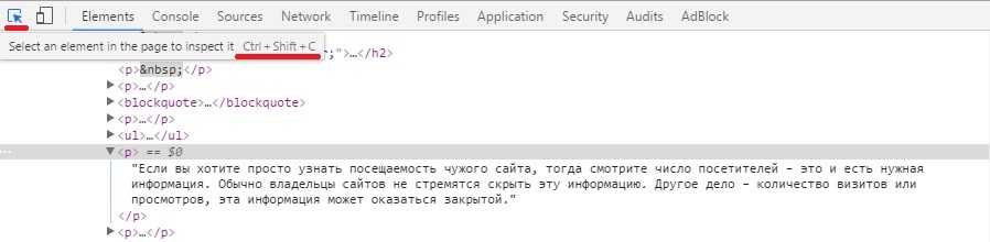 3. Нажмите кнопку F12 на нужной странице, а затем выберите в левом верхнем углу стрелочку или вместо этого нажмите сочетание клавиш ctrl + shift + c. Показываю на примере Google Chrome, но в других браузерах все работает примерно также.