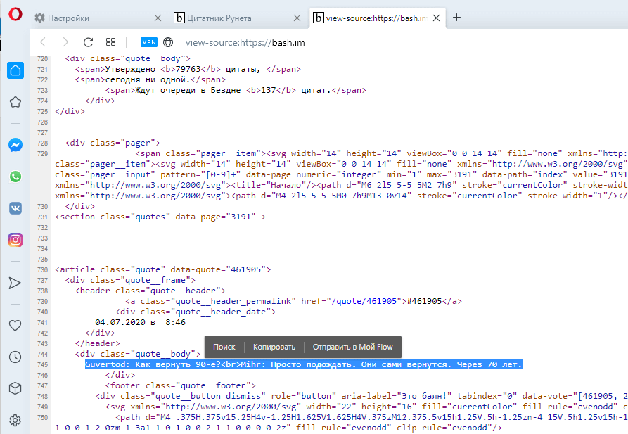 Самое простое действие – вызвать HTML-код комбинацией клавиш «Ctrl + U» (в тексте приводятся только комбинации клавиш, т.к. они являются универсальными. Действия, описанные с применением hot key, могут быть выполнены и при помощи меню браузеров). Работает всегда и покажет текст страницы вместе с разметкой и кодом скриптов. После этого достаточно найти нужное место, выделить, скопировать в текстовый редактор и очистить текст.