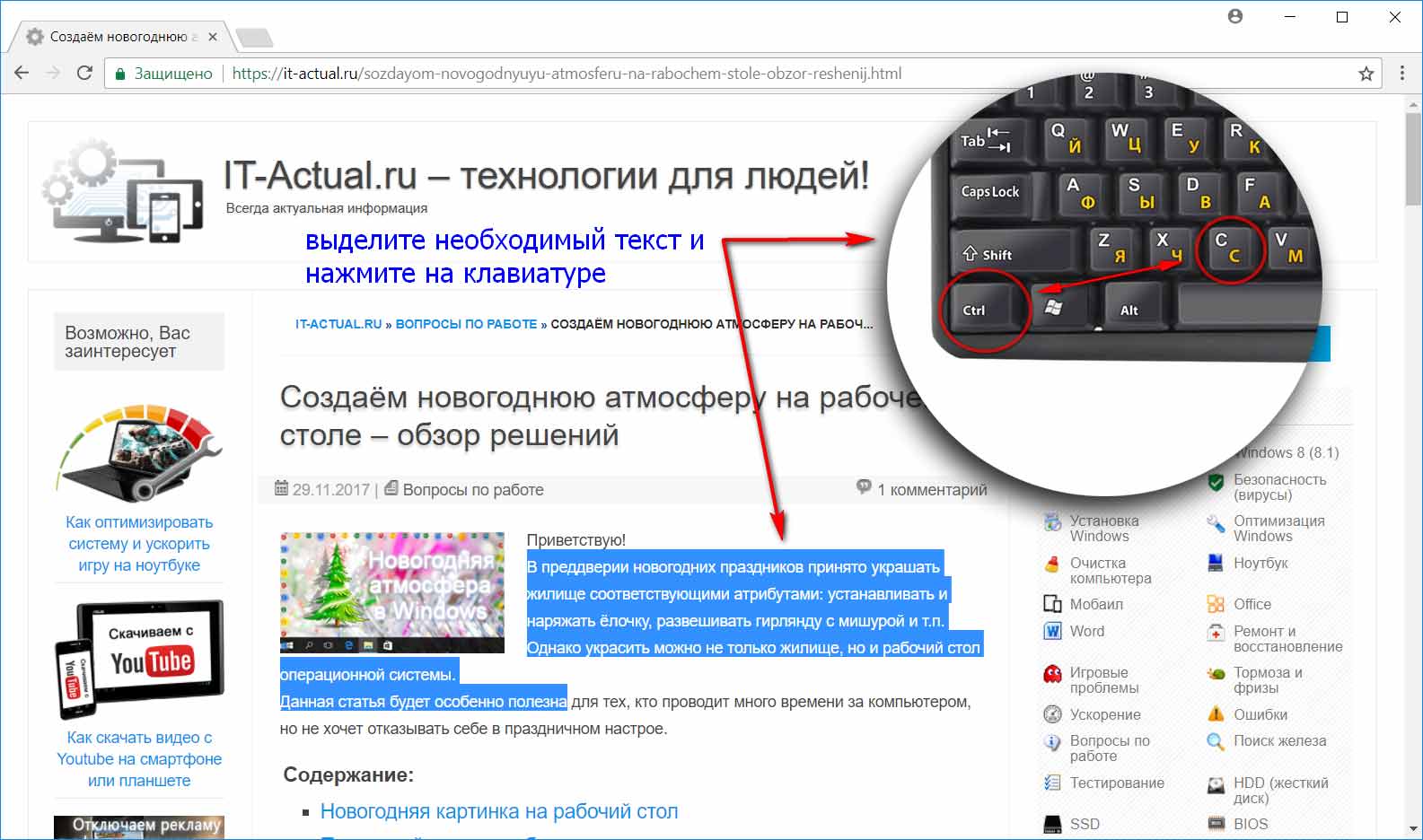 - Если сайт позволяет выделить текст, но «не даёт» вызвать контекстное при нажатии правой клавишей мышки, то следует нажать на клавиатуре комбинацию клавиш Ctrl + C.