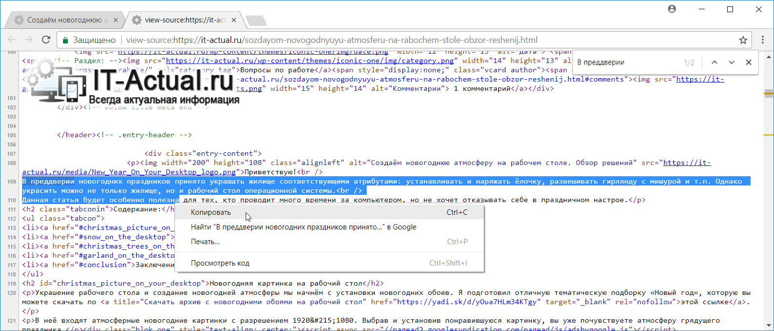 - Способ 1 — Ctrl + U. Нажмите сочетание клавиш «Ctrl + U», чтобы открыть исходный код страницы. Теперь можно найти необходимый фрагмент текста в коде, скопировать его и вставить в любой текстовый редактор.