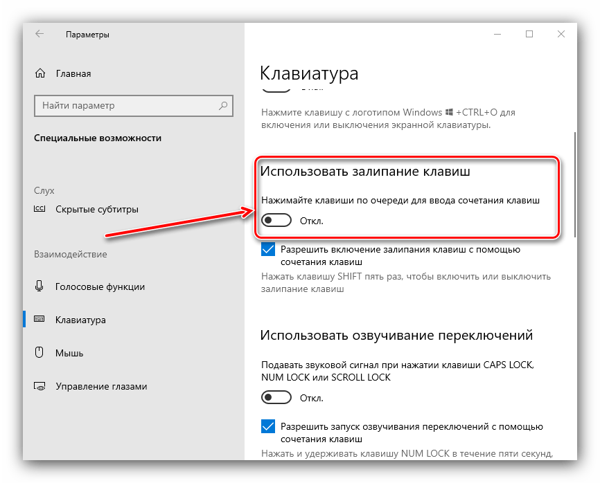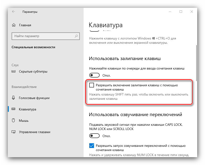 Также отключите пункт «Разрешить включение залипания клавиш с помощью сочетания клавиш».