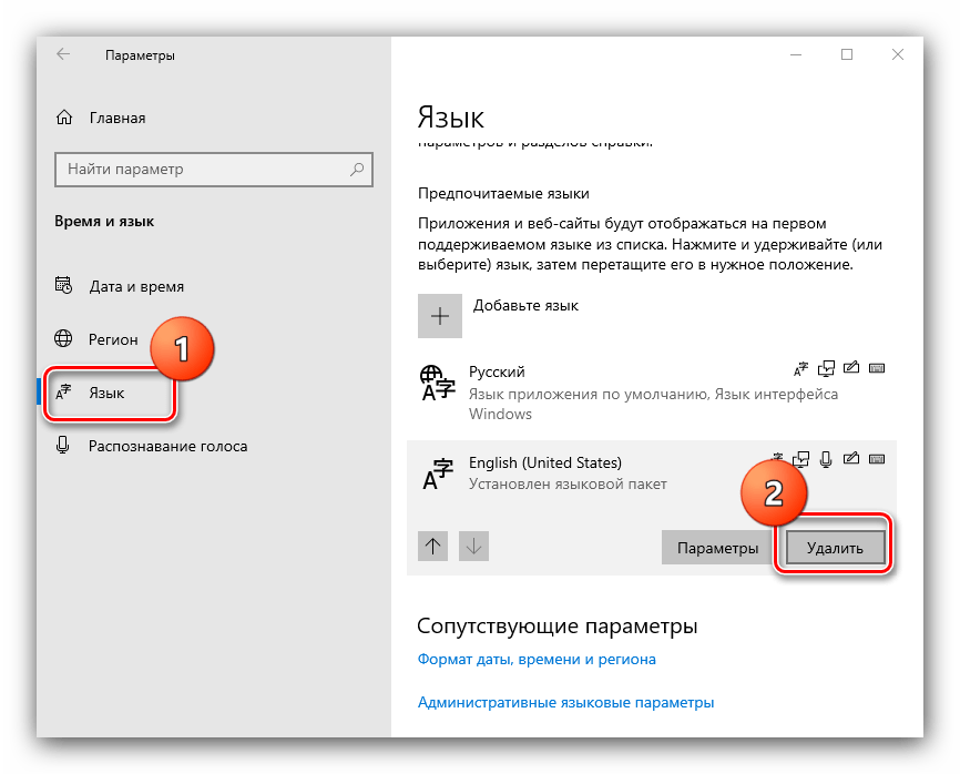 Откройте пункт «Язык», затем в правой части окна найдите список языков. Выделите его и нажмите на кнопку «Удалить».