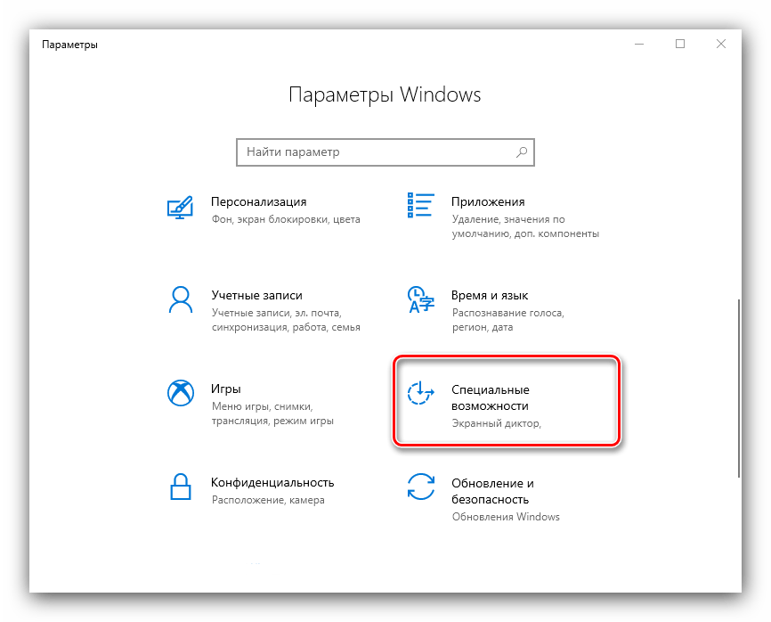 - Снова воспользуйтесь «Параметрами», но на этот раз выберите пункт «Специальные возможности».
