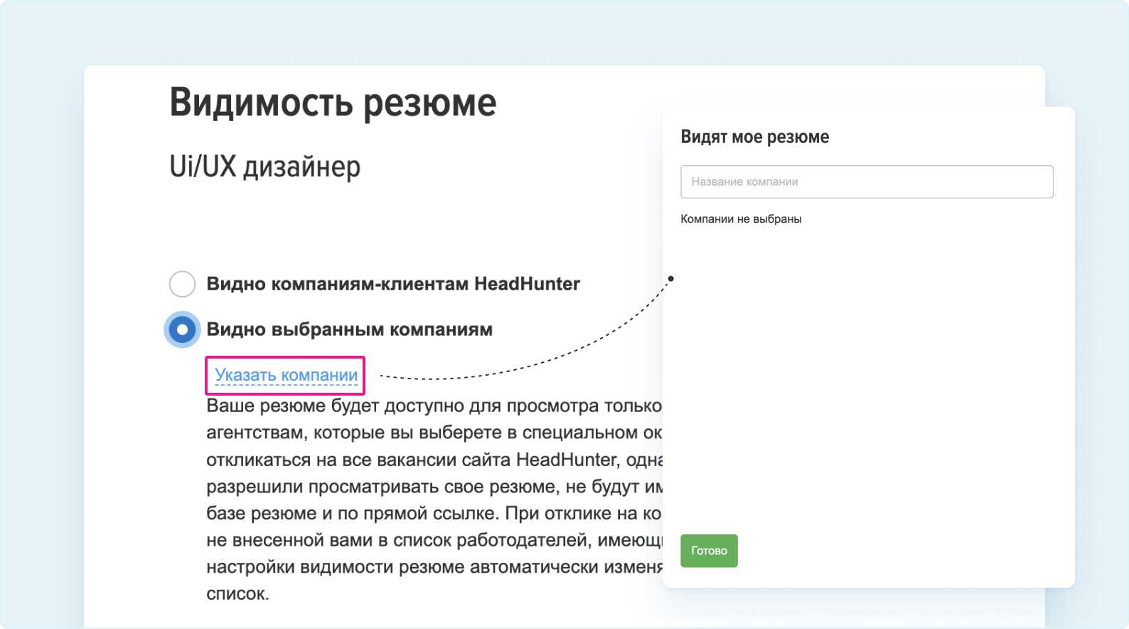 Ваше резюме будет доступно для просмотра всем компаниям и кадровым агентствам, которые зарегистрированы на hh.ru, кроме тех, которые вы выберете.