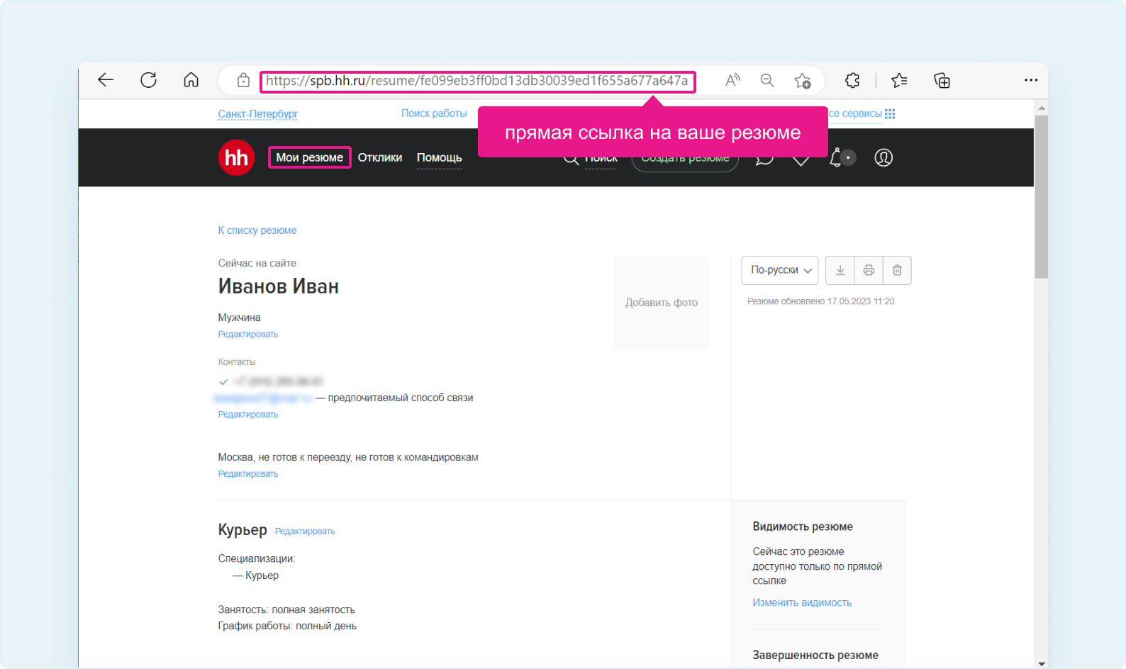 На странице выбора резюме, под каждой из доступных записей, можно настроить видимость для конкретной анкеты. Для этого стоит воспользоваться ссылкой «Изменить видимость». Удобнее всего выбрать пункт «Видно только по прямой ссылке». Эта опция, с одной стороны, обеспечивает пользователю достаточную приватность, с другой – позволяет делиться доступом к странице с документом при возникающей необходимости.