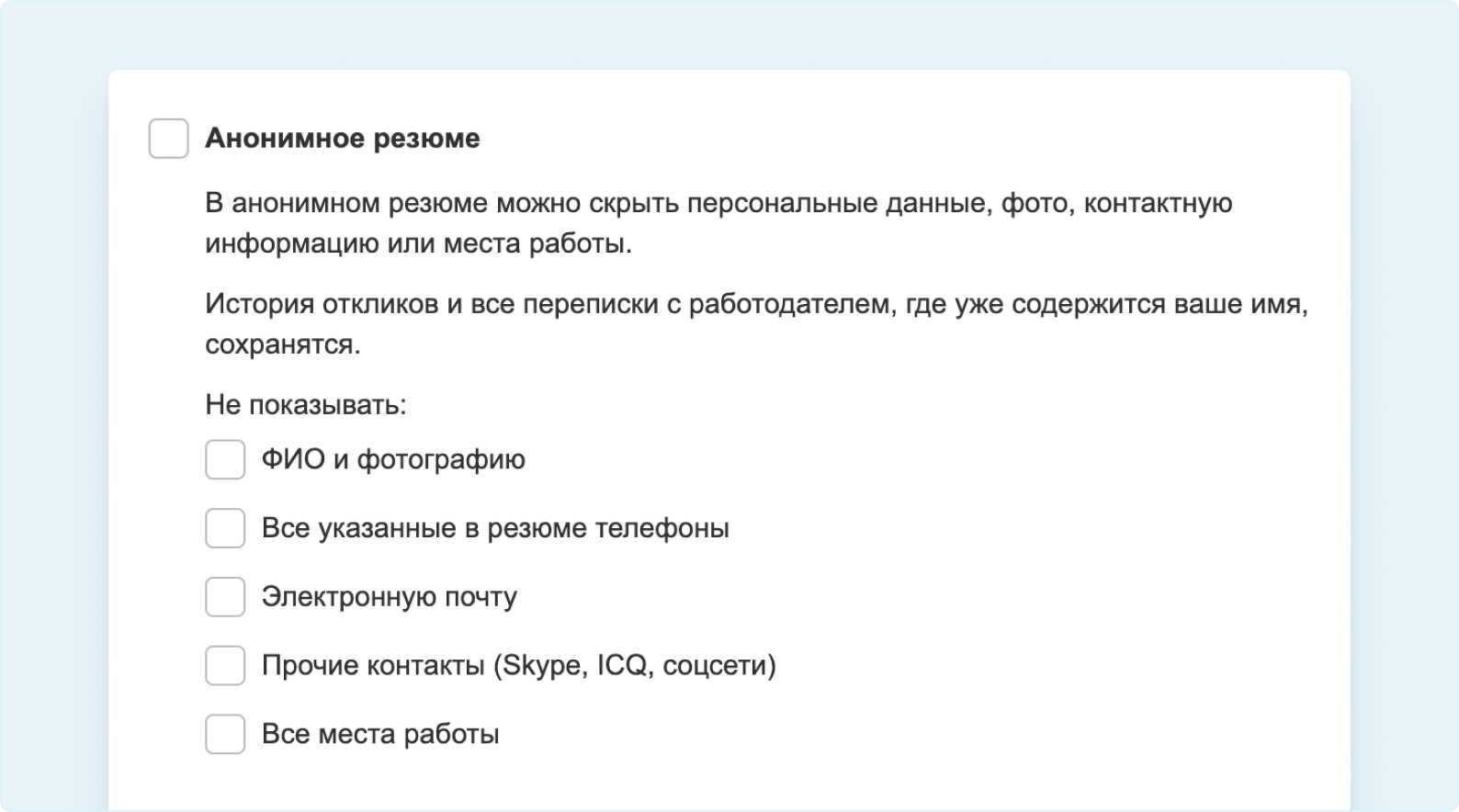 На той же странице настроек доступа предусмотрена секция «Анонимное резюме», посредством которой пользователь может скрыть отдельные разделы своего резюме: Ф. И. О., фото, все или отдельные контактные данные, места работы.