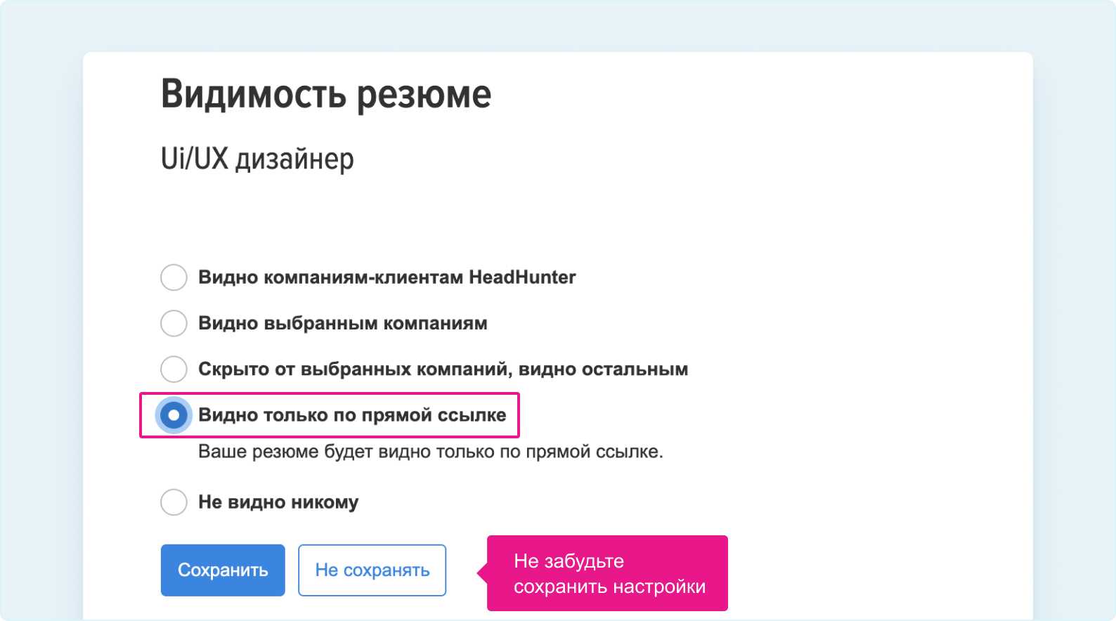 Публикуя на hh.ru резюме, вы сами решаете, кто сможет его видеть. Это определяется настройками видимости в личном кабинете в разделе «Мои резюме». Нажав на кнопку «Изменить видимость», вы попадёте на страницу, где можете отредактировать настройки видимости конкретного резюме. Выберите подходящие вам варианты и нажмите кнопку «Сохранить».