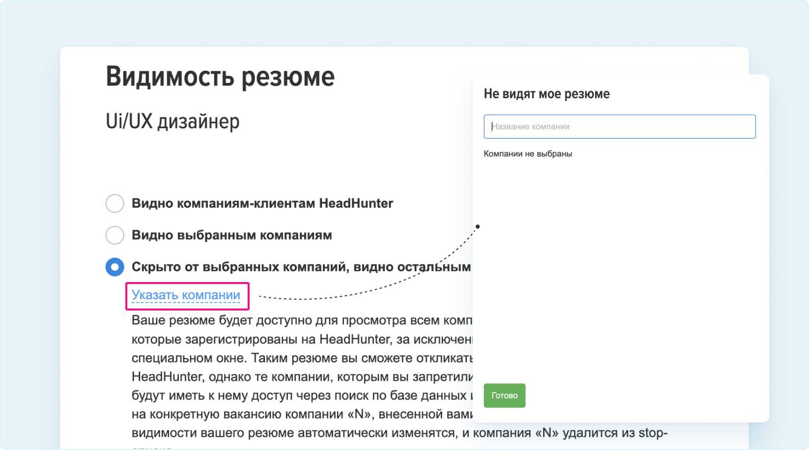 Вы сможете откликаться на все вакансии, однако те компании, которым вы запретили просматривать своё резюме, не будут иметь к нему доступ. Но при отклике на конкретную вакансию условной компании N, внесённой вами в стоп-список, настройки видимости вашего резюме автоматически изменятся, и компания N удалится из стоп-списка.