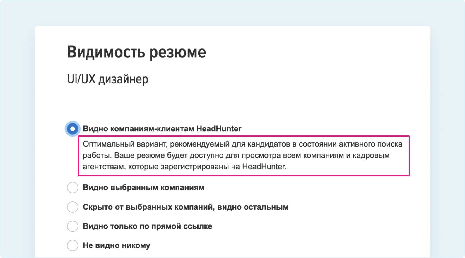 Это оптимальный вариант для соискателей в состоянии активного поиска работы. Ваше резюме будет доступно для просмотра всем компаниям и кадровым агентствам, которые зарегистрированы на HeadHunter.